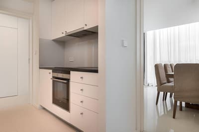 La décoration est plutôt minimaliste avec un élégant mobilier en bois, des pièces faisant référence à l'artisanat de la région et l’ensemble se complète dans des tons clairs. La chambre est dotée d’un lit double de 1,80 m et de lits superposés. La salle de bains en marbre est équipée d’une baignoire. Ambiance cosy !