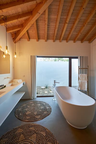 La décoration est dans un style rustique avec des hauts plafonds et les matériaux traditionnels se combinent aux lignes épurées de l'architecture et du mobilier. La chambre est dotée d’un grand lit confortable et la salle de bains, quintessence du luxe, est équipée d’une baignoire, d’un double vasque et des produits de beauté Maison Codage Paris. Ambiance champêtre !