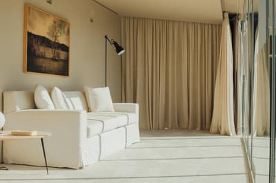 Simple et vraiment cosy, l’ensemble est très léger. Elle laisse pénétrer la lumière naturelle pour une pièce lumineuse et accueillante. D’un style minimaliste et épuré, elle est très design. Quelques touches de couleurs pastel égaient le tout.