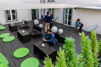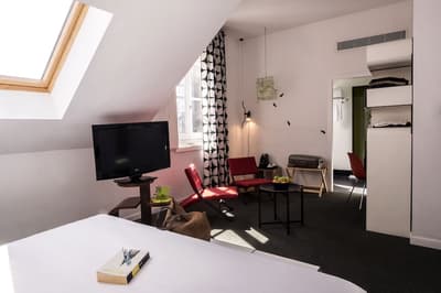 Le charme d’une bâtisse ancienne à l’extérieur, complètement rénovée à l’intérieur. Des murs du XVIIIe et un escalier d’époque alliés à une déco ultra contemporaine, épurée, immaculée… L’effet est bluffant. Un jeu de contraste parfaitement maîtrisé à travers tout ce boutique-hôtel. Escalier d’époque, salle de petit déjeuner aux allures de réfectoire, salon doté d’une banquette rouge tout en courbes, rooftop ensoleillé pour faire une pause-café ou boire un verre en fin de journée… tout a été pensé pour que vous vous sentiez à l’aise. Un peu comme chez vous. Le vrai « plus » ? C’est le mur paré de bons plans à tester absolument durant votre séjour. Expos, bistrots, restos, boutiques, galeries, dégustations de vins, vernissages… l’hôtel a fait sa sélection. Il la partage avec les voyageurs et les curieux. Malin : tout se passe à proximité, pas besoin de cavaler et aucun risque de vous perdre dans la ville. Enfin, prenez le temps de bouquiner, passer un coup de fil ou ne rien faire, sur le balcon de votre chambre. Elles n’en ont pas toutes, alors un conseil : demandez-en un au moment de la résa !