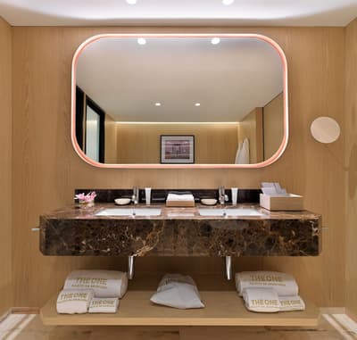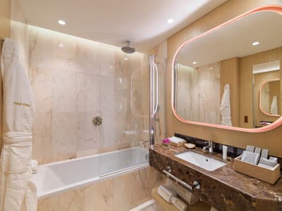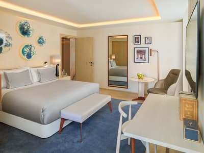 Confortable et élégante dans un espace fonctionnel, elle profite d’une jolie décoration et est plutôt minimaliste. La chambre est dotée d’un matelas king-size haut de gamme et la salle de bains en marbre est équipée de toilettes et douche séparée. Ambiance cosy !