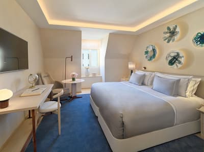 Confortable et élégante dans un espace fonctionnel, elle bénéficie d’une jolie décoration et est plutôt minimaliste. La chambre est dotée d’un matelas king-size haut de gamme et la salle de bains en marbre est équipée de toilettes et douche séparée. Ambiance cosy !