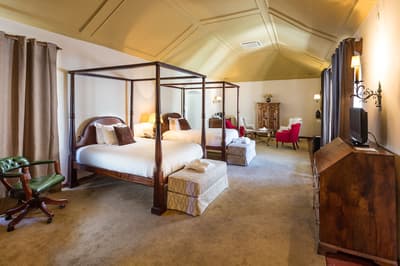 Cette belle chambre a tout le nécessaire pour être un petit cocon confortable et agréable. Ses fenêtres profitent d’une vue reposante. Elle accommode un grand lit ou des lits simples et elle dispose d’un petit bureau dans un coin de la pièce. Salle de bain chic.