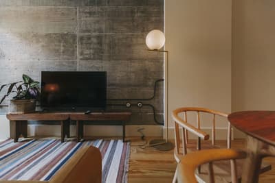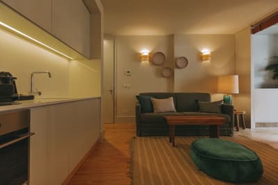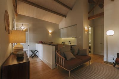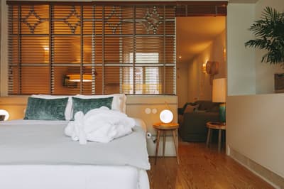 Plus spacieuse, c’est encore plus de confort ! Sa grande baie vitrée offre une vue reposante et merveilleuse sur la ville vibrante. Le grand salon est meublé d’un canapé-lit et de beaux fauteuils pour se relaxer. Très pratique, elle bénéficie d’une table à manger et d'une kitchenette. Salle de bain chic.
