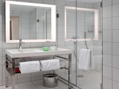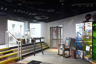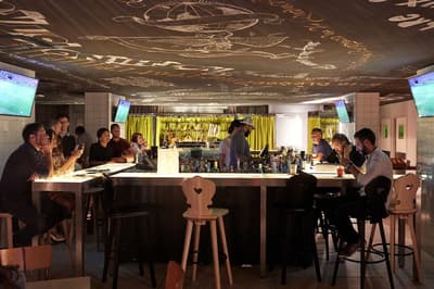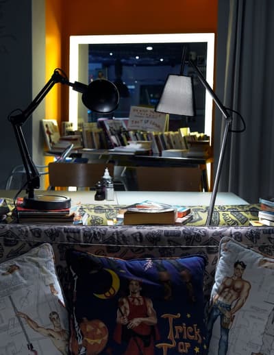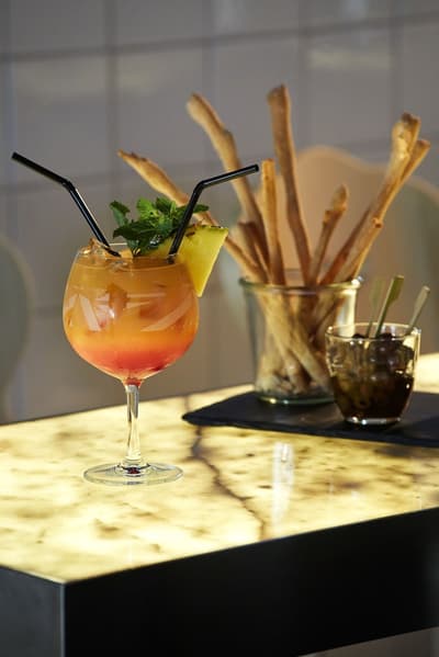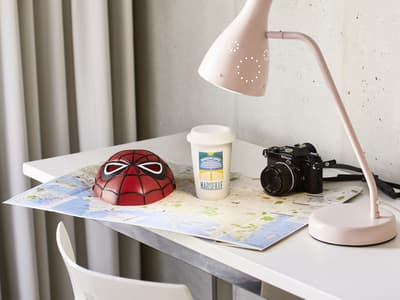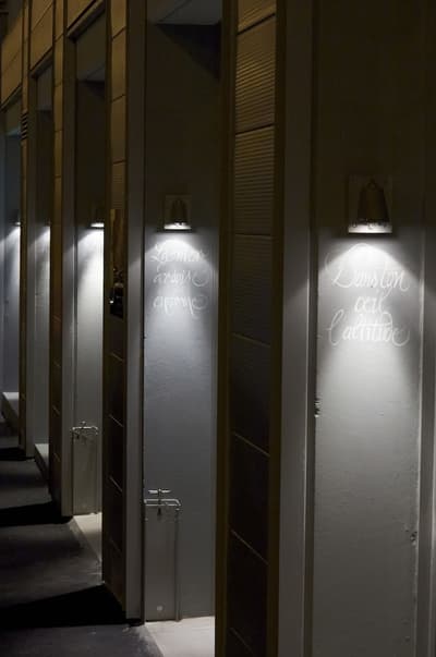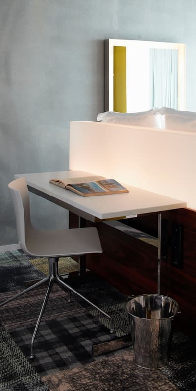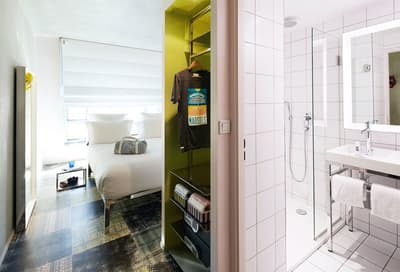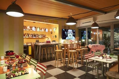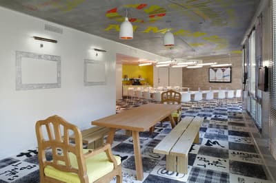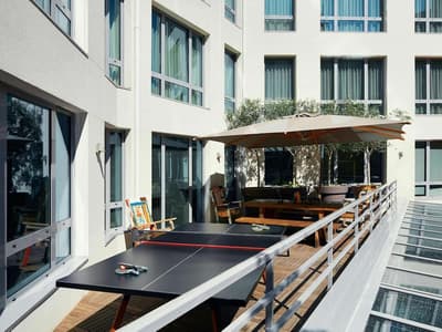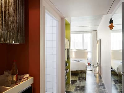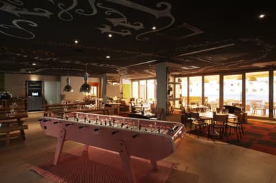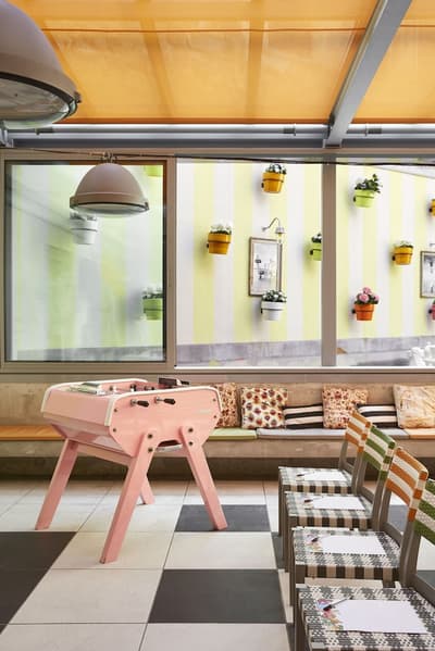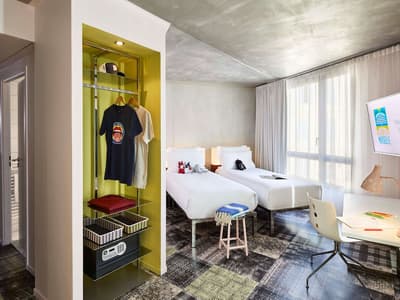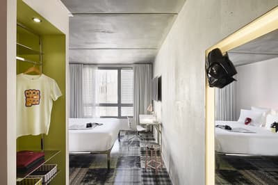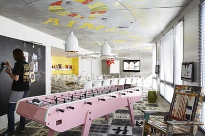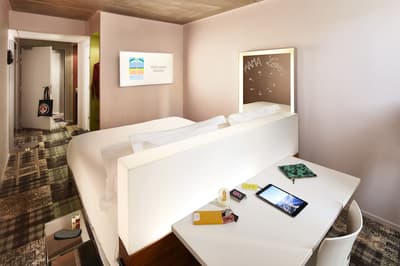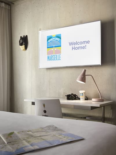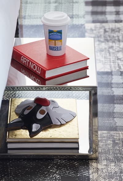 De l’extérieur, c’est un édifice de six niveaux, tout en béton et aluminium, voisin du Cours Julien. Puis vous poussez la porte et là, c’est le début de la fête : ambiance Mama à tous les étages ! Avec le design délicieusement délirant de Philippe Starck, sur le thème de la mer — grande bleue oblige. Tapis d’entrée et rideaux sont parés de motifs de sardines, des poulpes en métal jalonnent les parties communes, des bouées gonflables sont suspendues au plafond du resto… Le long des couloirs blancs, noirs et gris, vous suivez les indications au sol pour vous diriger jusqu’à votre chambre. Là, déco épurée, murs en béton brut, mais touches colorées grâce aux poufs fuchsia posés sur un sol aux carreaux dépareillés. A cela s’ajoutent des goodies partout : masques pour enfants, gobelet « Mama loves Marseille », tee-shirt... tout s’affiche et s’achète à la boutique du Mama. Et sinon, vous allez adorer la fiesta non stop au bar, et les repas de copains autour d’une longue table en bois clair, avec ses bancs recouverts de coussins multicolores, sous un plafond décoré d'inscriptions à la craie. C’est tout ça, l'esprit Mama !