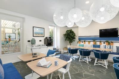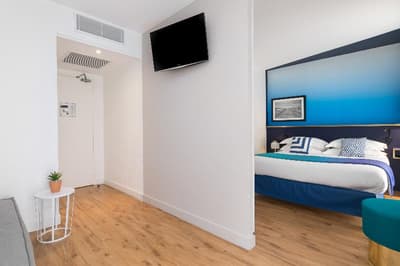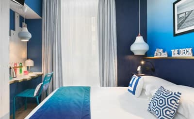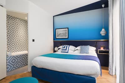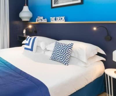Prenez des camaïeux de bleus, beaucoup de blanc, un soupçon de jaune citron et quelques lignes géométriques. Appliquez ce cocktail sur les murs, les meubles, les coussins, les accessoires… La déco qui en résulte et même toute l’atmosphère évoquent irrésistiblement les vacances en Méditerranée, à mi-chemin entre la Grèce et la Riviera. A commencer par les fauteuils balancelles suspendus dès le couloir d’entrée ! D’autant qu’un billard, of course blanc avec un tapis bleu, et un babyfoot, accentuent le côté ludique et décontracté du séjour. On a presque envie de parler de croisière, tant le concept et le nom de ce charmant hôtel 4* sont bien choisis. Dans le même esprit, les chambres design sont d’ailleurs appelées cabines et les étages deviennent des ponts (deck in english) ! Continuons la métaphore. Aux petits soins avec les passagers, l’équipage est incroyable. Carton plein pour Saloua, Jérôme, Soline, Nicolas… Les mêmes prénoms reviennent inlassablement dans les commentaires, mentionnant leur chaleur, leur sourire, leur disponibilité. A cela s’ajoutent un bar calqué sur ceux de la plage, une lumineuse terrasse, un salon cosy et un emplacement top niveau à deux pas de la Promenade des Anglais. Alors, vous embarquez bientôt ?