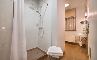 Petite mais tout à fait confortable, elle a tout ce qu’il faut pour un séjour superbe. Cette chambre accommode un lit queen et dispose d’un bureau dans un coin de la pièce. Salle de bain chic.