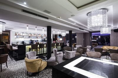 Envie de vous envoler dans la galaxie en dansant comme Ryan Gosling et Emma Stone dans La La Land ? C’est possible au Kings Court ! Comment ça, vous n’y croyez pas ? Si personne n’essaie, c’est normal que personne n’y arrive. Alors soyez le cobaye ! Vous verrez, la piscine à l’intérieur du spa propose une ambiance incroyable, digne de la scène du planétarium dans le film de Damien Chazelle. Des lumières bleues, une galaxie de spots étoilés au plafond et des statues qui sont là pour veiller sur vous. Après, vous pouvez aussi essayer de vous envoler avec elles mais ça paraît un peu surréaliste. Voilà pour vous montrer un peu l’expérience cinq étoiles du Kings Court. Ou plutôt royale, comme son nom l’indique. A l’intérieur, des chandeliers qui brillent de mille feux, de la moquette bleu royal et une décoration super chic. Là, vous serez plutôt dans The Crown. Pour le reste, salle de sport ouverte à toute heure du jour et de la nuit, des massages divins, un menu d’oreillers et… UN CASINO ! Jamais deux sans trois, là, on mise plutôt sur Casino Royale. Vous l’aurez compris : le Kings Court possède son propre petit monde à part en plein milieu de Prague.