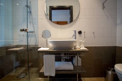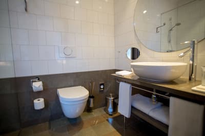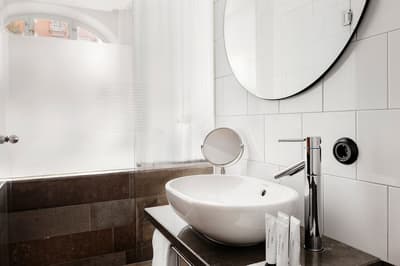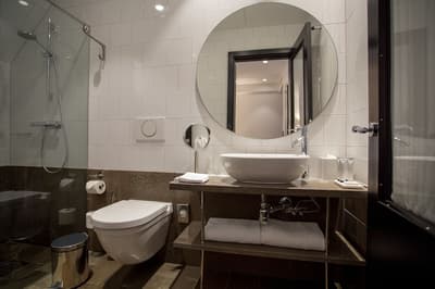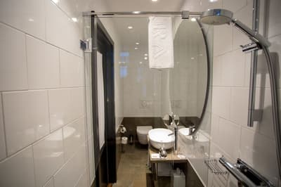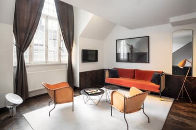 Dans un design et confort personnel, elle comprend de hauts plafonds, un parquet point de Hongrie foncé et un lit de 180 cm de Bed Factory Sweden avec draps égyptiens. La salle de bains est habillée de calcaire et dans certaines chambres de cette catégorie, les salles de bains sont séparées par une porte vitrée. Le tout dans une atmosphère conviviale !