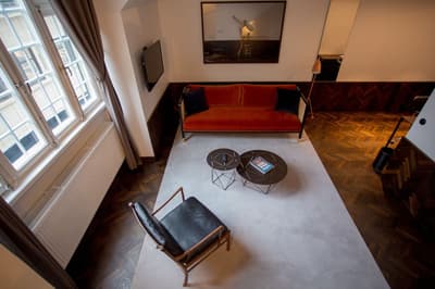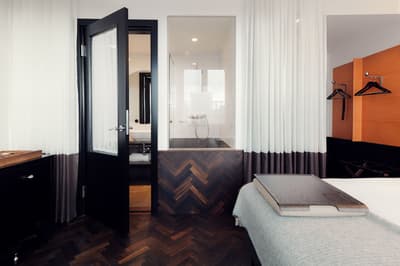 Dans un design et confort personnel, elle comprend de hauts plafonds, un parquet point de Hongrie foncé et un lit de 180 cm de Bed Factory Sweden avec draps égyptiens. La salle de bains est habillée de calcaire et à noter que dans certaines chambres de cette catégorie, les salles de bains sont séparées par une porte vitrée. Le tout dans une atmosphère conviviale !
