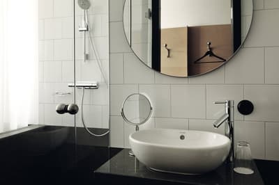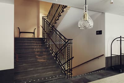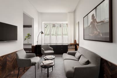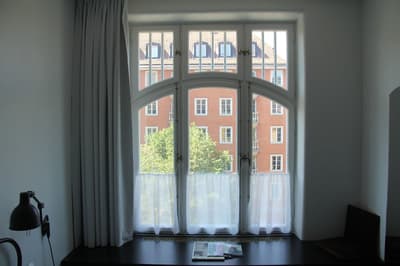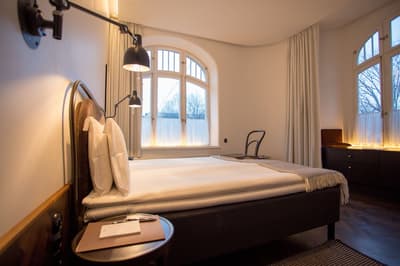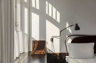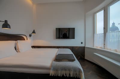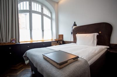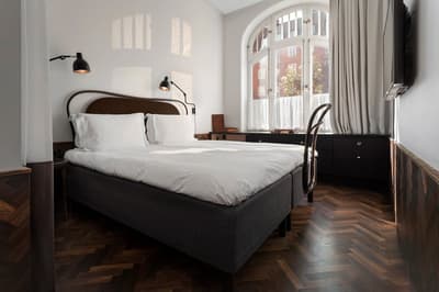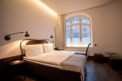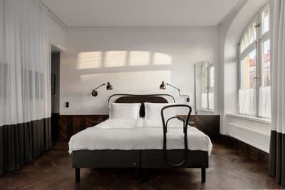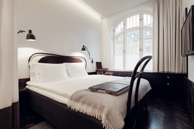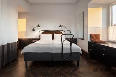 Et si on retournait à l'école le temps d'un week-end ? Ici, les matières à fort coefficient sont le design suédois et la gastronomie italienne. Les dalles en marbre portent encore les marques des centaines de jeunes filles qui se sont succédées dans les couloirs de l'Ateneum, leurs bouquins sous le bras... Miss Clara, c'est avant tout l'un des plus beaux bâtiments Art Nouveau de la ville, et à la base une école de filles très réputée. Son nom ? Un clin d'œil à sa directrice la plus mémorable, Clara Strömberg — engagée et défiant les normes. Pour accéder aux chambres, vous emprunterez l'escalier d'origine, vos bagages en guise de cartables. Le starchitecte local Gert Wingårdh a reconfiguré le bâtiment construit en 1910 en mélangeant habilement les détails Art Nouveau avec des touches plus modernes : des têtes de lit en bois courbé de la fabrique de meubles suédoise Gemla, des lampes en cristal Le Broom, des fauteuils Kaare Klint, des parquets de chêne teinté venant manger les hauts murs blancs... Et si les hauts plafonds et la blancheur omniprésente peuvent sembler froids et austères, de belles matières naturelles viennent réchauffer l’ambiance, comme les grands rideaux de coton sur les portes vitrées d'origine.