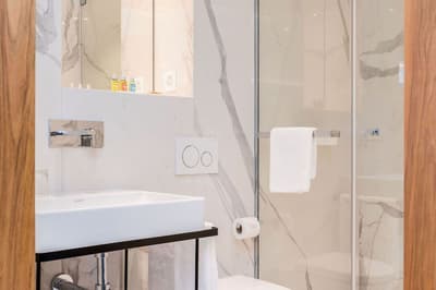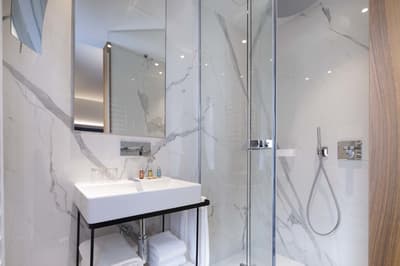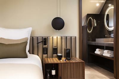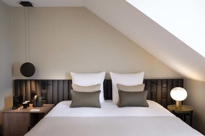 Harmonieuse et élégante, elle comprend une décoration raffinée signée Sybille De Margerie avec une belle moquette épaisse, un mobilier élégant, des accessoires design, des tissus soyeux et se complète dans des couleurs douces et un éclairage discret et éclectique. La chambre est dotée d’un lit king size (180X200) et d’une literie d'excellente qualité. La salle de bains en marbre est équipée d’une grande douche à l’italienne. Le tout dans une ambiance chic et cosy !