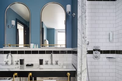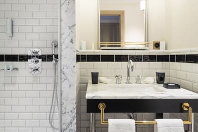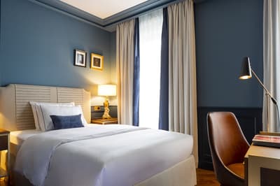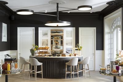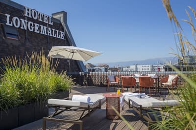 C’est la grande classe au Longemalle ! L’hôtel est déjà remarquable par sa façade merveilleuse, dressée au bord d'une place végétalisée, juste à côté du somptueux lac Léman. Mais le lieu a aussi une âme, et ça se sent ! Poussez les portes : dans le lobby à baies vitrées et verrières, hyper tendance, un canapé Chesterfield en cuir vieilli, posé sur un magnifique tapis bleuté, fait face à une cheminée en marbre sublime. Et derrière le comptoir noir et doré, c’est le sourire assuré du personnel d’accueil ! Chaque petite touche de déco amène de la personnalité à ce spot historique. De vieilles affiches, des livres en cuir ou tendance design, d'anciens transistors, un coffre clouté noir, des murs bleu Navy et taupe, ajoutent de l’intimité. Et c'est un lieu qui donne le smile : vous allez prendre votre dose de soleil à la table du resto libanais, dans cette salle à la fois baroque et moderne avec ses tables en marbre noir et jaune. C’est aussi ici que vous savourerez votre petit déjeuner. Lampes nappés de carpes japonaises, rose fuchsia, noir mat, photos en noir et blanc, banquettes rouges et chaises scandinaves... le Longemalle n'entre dans aucune case déco, et c'est ça qu’on adore ! Un hôtel chic et ultra confort !