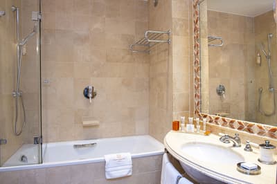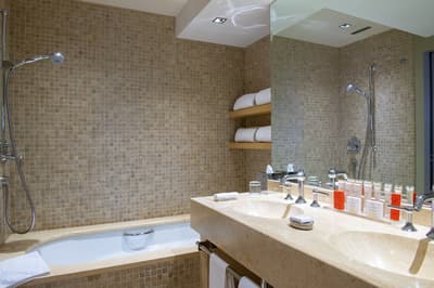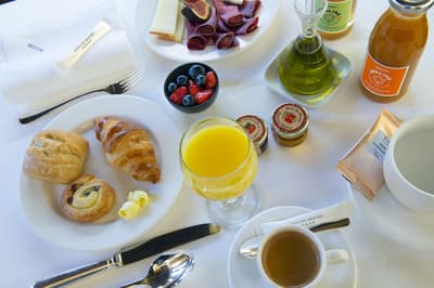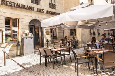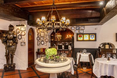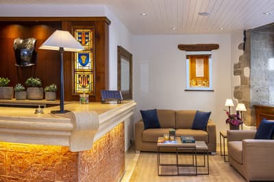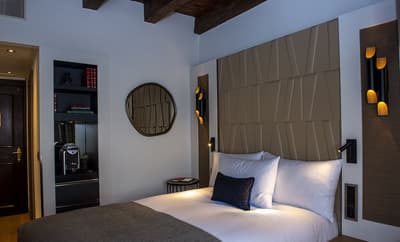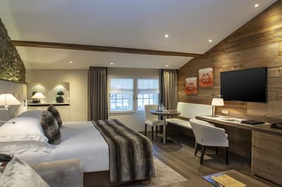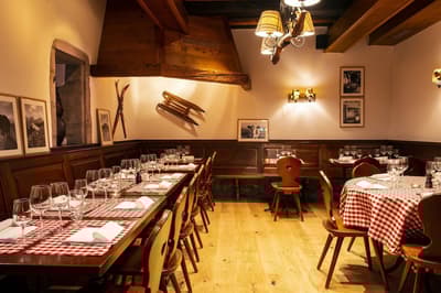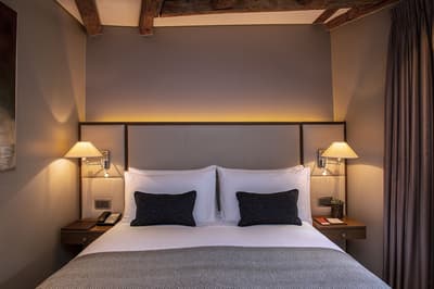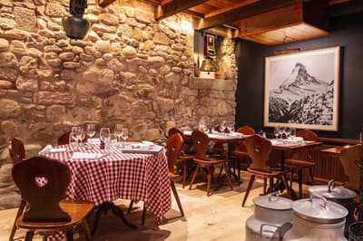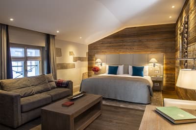 Pas de doute, vous êtes bien en Suisse quand vous séjournez aux Armures. L’hôtel est une ode au pays tout entier ! Pas étonnant que George Clooney himself l'ait déjà choisi pour découvrir Genève... Dès l’entrée, vous avez l’impression de pénétrer dans une capsule temporelle, cachée derrière ces murs de pierre aux allures médiévales. Le rez-de-chaussée, nappé de bois ancien, et les étendards qui trônent au-dessus de la porte, accentuent encore cette sensation ! Les vieilles photos, les cloches énormes, les armures véritables, les lustres vêtus de tissus écossais, logés sur des bois de cerf... tout cela vous plonge dans une ambiance réconfortante à souhait. Dans les étages, le charme reste intact, grâce aux fenêtres encadrées de pierres apparentes et aux poutres qui gardent parfois les délicats dessins d’antan. Et vraiment, les plafonds sont dingues ! Quant à la déco des chambres, elle a été pensée tout exprès pour créer un esprit chalet moderne et ultra-cosy, avec des matières chaleureuses. Et même le resto vous donnera l’impression d’être au beau milieu des Alpes : ici, des photos de la Gruyère enneigée s'associent à des chaises en bois foncé, des nappes à carreaux rouges et blancs et des pots au lait. Un savant mélange de tradition et de modernité, qui vous assure une escapade hyper immersive dans une maison qui a gardé son âme. Dernier petit plus : aux beaux jours, vous avez une terrasse canon au pied de l’hôtel !