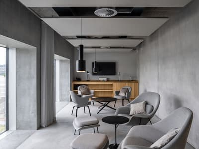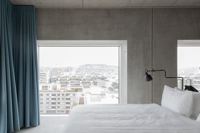 Un hôtel design à la déco minimaliste avec des matières brutes et une vue top sur la ville.