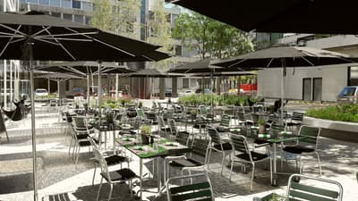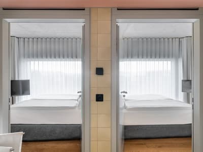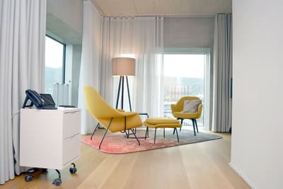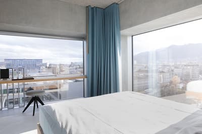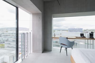 Une atmosphère à la fois minimaliste et confortable vous attend au Placid Hotel Design & Lifestyle de Zurich ! L’hôtel est installé dans un bâtiment flambant neuf blanc et massif. A l’intérieur, le less is more règne, avec un accent sur les espaces aérés et les ouvertures. On est loin du baroque italien : on se rapproche plus des ambiances scandinaves apaisantes, avec des couleurs douces, du bois clair et du béton ciré en guest-star. On adore aussi ces grandes baies vitrées de plain-pied, qui nous donne l’impression de planer dans cet immeuble de 11 étages, avec une vue spectaculaire sur Zurich et ses alentours. Sur le toit, à 40 mètres de haut, vous profitez pleinement de ce panorama grâce à une terrasse aménagée où chiller à souhait. Des salons apaisants sont aussi à votre dispo. Quant au resto, il reste dans cette sobriété heureuse, avec ses lampes de style industriel. Et dans l’assiette ? On se régale de plats tendance comme le burger au black Angus ou un risotto crémeux délicieux. Le petit dej ? A la fois simple et complet ! D’excellents œufs vous attendent, et des saucisses déclinées aussi en veggie, du bacon et du poisson fumé de la région. Pressé de partir à la découverte de la ville suisse ? Optez pour le Grab & Go avec un café, un croissant et un muffin à emporter ! Bref, c’est une escale très sympa, et reposante avec son design épuré. Dernier mot : les meubles ont été fabriqués en Suisse et la location de vélos est gratuite !