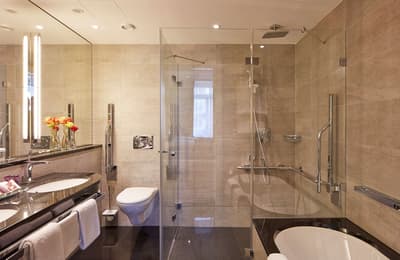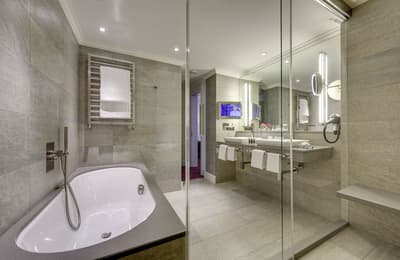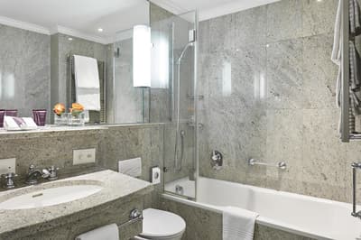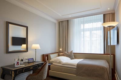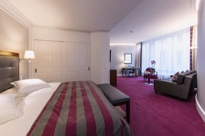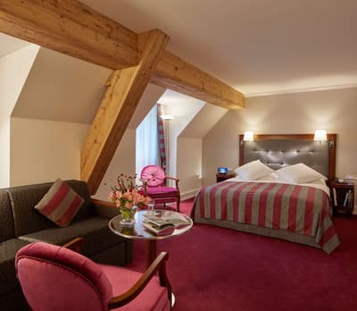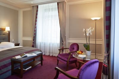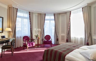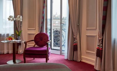 Vous allez vivre une expérience un peu hors du temps en venant séjourner au Schweizerhof Zurich ! L’hôtel est un savant mélange de modernité et d’histoire avec ses 140 ans d’existence... Imaginez : vous arrivez au pied de cette façade iconique de la place de la gare centrale, traversée par le tramway de la ville. Vous déposez votre voiture devant, et on s’occupe de tout. Vous dégustez un verre de vin en attendant votre checking en profitant de cette atmosphère Art Nouveau (avec ce carrelage tricolore plutôt Art Déco et ce comptoir en marbre gris). Vous regardez les lustres en cristal, qui apportent un charme fou. Puis un membre de l’équipage, vêtu de rouge, vous montre le chemin jusqu’à votre chambre, où vous attend une corbeille de fruits — disposée dans un univers rococo modéré cosy, avec ce rouge qui tire sur le violet qui nappe le sol. Et toujours ces lustres merveilleux... Pas de doute, vous êtes vraiment dans un lieu emblématique de Zurich ! Le lendemain, au petit déjeuner, vous vous régalez de viennoiseries, d’œufs préparés à merveilles, de birchmuesli et de saumon fumé. Sur fond nostalgique, vous prenez un plaisir immense à vivre dans cette douceur préservée. Avec tout le confort moderne et une implication écologique reconnue !