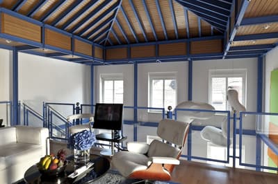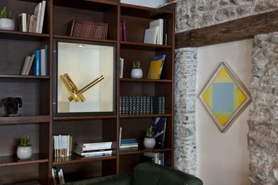 Classe et moderne, l’ensemble est élégant. Elle laisse pénétrer la lumière naturelle pour une pièce lumineuse et accueillante. Le mélange de bois, de verre et de métal rend harmonieuse. Quelques touches de couleurs lui donnent du peps.