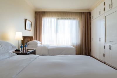 Si vous êtes dans la ville pour un voyage de découverte qui plus est avec votre meilleur ami, cette chambre comprend deux lits jumeaux pour dormir côte à côte, en se racontant les aventures de la journée. Elle est située en étage élevé et offre une vue captivante sur la piscine. Si besoin est, elle comprend également un bureau.