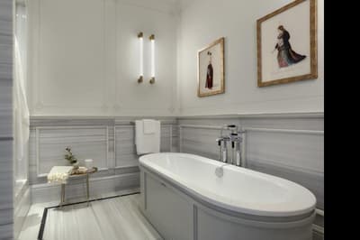 L’ensemble est dans un style résolument épuré et raffiné avec un beau parquet et se complète dans des tons sourds de taupe et de blanc antique et des meubles classiques. La chambre est dotée d’un lit king-size avec des raccords en laiton, un tapis et une décoration aux teintes douces et apaisantes. La salle de bains ovale en marbre comprend un haut plafond et est équipée d’une baignoire et d’une douche séparées. Le tout dans une ambiance conviviale !