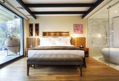 La folie des grandeurs ! C'est vraiment la bonne expression pour désigner cet hôtel, aussi bien au sens propre qu’au sens figuré. Avant même de rentrer à l’intérieur, le bâtiment devrait déjà vous faire de l’œil, depuis cette pente descendante sur laquelle il est situé, le rendant encore plus imposant qu’il ne l’est vraiment. Les suites, elles, c’est le grand luxe avec antiquités et meubles design qui sont un régal pour les yeux. L’hôtel mérite amplement sa place parmi les "Small Luxury Hotels of the World"… Mais ce qui marque le plus, ce sont les grands lits, grands canapés, grands tableaux abstraits aux murs : ici, les unités de longueur sont différentes, c’est la franchement seule explication plausible ! Ou alors, c'est vous qui avez rétréci... Et ce n’est pas que dans les chambres : même le long des couloirs, des petites passerelles vous frayent un chemin vers les chambres, entre d’autres tableaux encore plus grands, verticaux cette fois-ci… Néanmoins, le clou du spectacle reste tout de même le restaurant gastronomique sur le rooftop spectaculaire. Echec et mat !