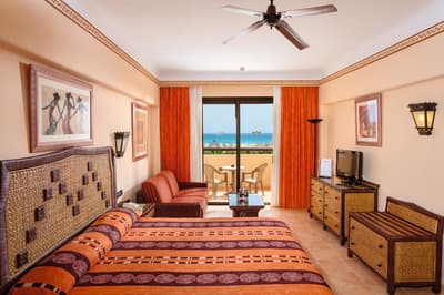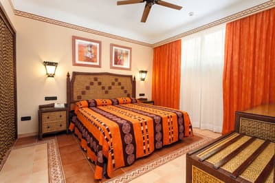La décoration est plutôt classique et moderne avec un mobilier typiquement africain et la chambre est dotée de deux lits de 110 x 200 cm avec une literie à motifs africains. Elle comprend également un canapé confortable pour se détendre devant la télé et la salle de bains est bien équipée avec un double vasque entre autres. Le tout dans une atmosphère accueillante !