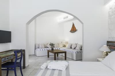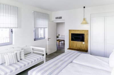 Elle combine à merveille l'architecture crétoise à l'élégance moderne avec des murs en pierre, un beau carrelage, un mobilier en bois et se complète dans une dominance de blanc. Les deux chambres sont dotées de lits jumeaux ou doubles et d'un espace séparé avec canapés-lits. La salle de bains moderne est équipée d’une cabine de douche à l'italienne et/ou baignoire. Ambiance tropicale !