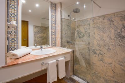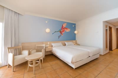 Installée à proximité de la piscine, cette belle chambre familiale profite d’une vue apaisante. Elle est intelligemment conçue et peut accueillir un lit supplémentaire et un canapé-lit. Son espace extérieur est aménagé de belles chaises et d’une table pour apprécier le cadre reposant. Elle peut accommoder un lit supplémentaire et dispose d’un canapé-lit. Petite table à manger dans la chambre. Salle de bain chic.