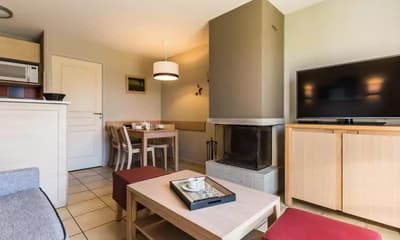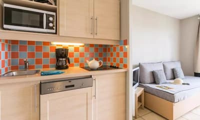 La résidence propose des studios et appartements en hébergement standard. Mais aussi des appartements et des maisonnettes en catégorie supérieure. Les logements sont lumineux avec une prédominance de bois clair et une déco épurée. Tous disposent d’un balcon ou d’une terrasse avec vue sur le golf. Tous les logements possèdent aussi une kichenette équipée d’un four, de plaques à induction et d’un frigo.