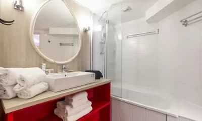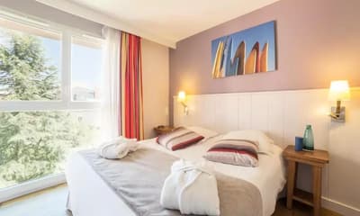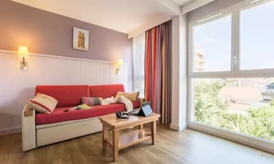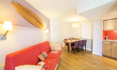 Vacances, j’oublie tout… Sauf les planches de surf ! Direction Biarritz et, tant qu’à faire, en centre-ville mais à 5 minutes de la plage ! D’accord, vous ne vous extasierez pas sur la façade, propre mais sans grand intérêt. Papotez plutôt en attendant l’ascenseur, vous n’êtes pas les seuls à arriver ! Allez, dites-nous tout. Vous êtes à 2 ou en tribu ? Vous avez choisi le studio de 30 m2 ou le 3 pièces de 50 m2 ? Un conseil, si vous n’aimez pas être à l’étroit, pour l’appart, prenez une taille au-dessus ! Un parquet blond, des canapés rouge et beige et, au mur, une planche de surf : elle vous plait, la déco ? En tout cas, elle est gaie, et l’appart plutôt bien équipé et of course climatisé ! Chouette, les lits sont faits et on vous a même prévu le ménage à mi-séjour. Redescendez à la réception. Pendant que les enfants s’amusent déjà sur l’aire de jeux, programmez donc votre journée. Surf ou golf aujourd’hui ? La plage à 300 mètres ou l’arrière-pays en voiture ? En rentrant ce soir, un sauna ou une séance au hammam, histoire de vous délasser. Juste à temps pour vous servir un verre sur le solarium de la terrasse en bois. Ah, et n’oubliez pas de réserver les croissants et le pain frais. Les vacances, c’est surtout fait pour en profiter !