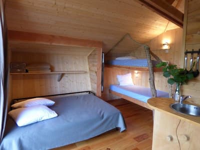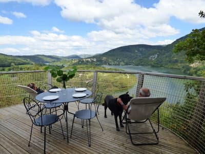 Le domaine de Serrières va droit à l’essentiel et propose une offre d’hébergements de cabanes perchées dans les arbres avec une vue canon sur un coude de l’Ain et les forêts environnantes.