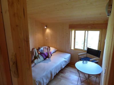 Un jour ou l’autre, la tentation du retour à l’essentiel vient toquer à la porte de nos petits trains-trains quotidiens. Une sorte d’appel à réduire la voilure, à ralentir le rythme, à poser son esprit retentit alors dans nos esprits qui tournent à mille à l’heure. Nous en avons trouvé la source. C’est le domaine de Serrières, dans l’Ain, tout près de Bourg-en-Bresse et de la frontière suisse, qui chuchote sa solution secrète que Fairmoove vous dévoile ici. Prenez une poignée de cabanes perchées dans les arbres, à flanc de colline, et qui dominent un paysage serein. Ajoutez-y un doux coude bleu de l’Ain où se love une petite île mystérieuse. Saupoudrez le domaine de grands chênes qui frissonnent au vent et, le soir venu, quelques chamois qui sortent du bois. Nous, ça nous a charmé. Et, le charme fût complet lorsqu’arrivés à l’intérieur des cabanes taillées pour les couples comme pour les familles, nous y avons vu une salle de bain, une cuisine équipée et du chauffage. Le tout, il faut le souligner, dans une atmosphère lumineuse, simple et chaleureuse. Les cabanes sont faites en bois et puis c’est tout. Un retour à l’essentiel qu’on vous disait !