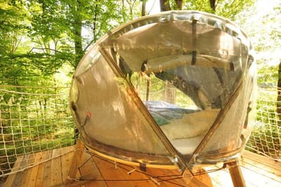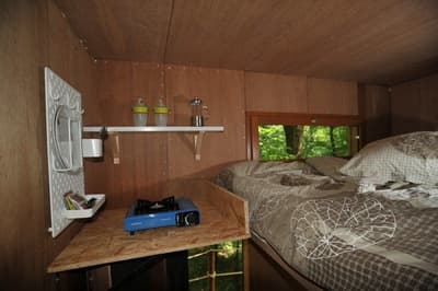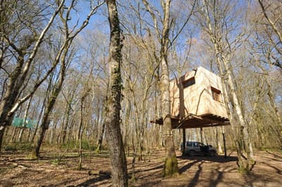 Peut importe la saison ! Voilà de rares cabanes isolées et chauffées, donc habitables toute l'année de janvier à décembre ; au cœur de la Franche-Comté, c’est rare. Et ça tombe bien puisqu'elles se trouvent dans le Val d'Amour, nom donné à la basse vallée de la Loue, dans le département du Jura. Ça y est, vous avez trouvé votre adresse pour la prochaine Saint Valentin ! Construites par le gérant de l'accrobranche voisin dans une parcelle de la forêt communale de Mont sous Vaudrey, au sud de la célèbre forêt de Chaux, elles sont assez originales et très graphiques. Comme des cubes ou des rectangles embrassant des vieux chênes, chaque cabane installée entre trois et cinq mètres de haut offre un couchage pour deux à quatre personnes, un coin cuisine avec point cuisson, casserole et couverts, et des toilettes sèches. On fera un brin de toilette grâce à de l’eau chauffée par panneaux solaires. Il y a également une bulle posée sur une plate-forme. Une bibliothèque et des magazines sont à disposition comme une prise USB pour recharger vos téléphones. Le linge de couchage et de douche est fourni. La gare de Dole est à 17 kms et la magnifique saline d'Arc-et-Senans à une vingtaine de kilomètres.