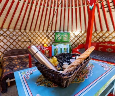 Les steppes de Mongolie ne seront plus très loin lors d’un séjour au Village des Yourtes en Bretagne ! À moins de 5 kilomètres de la splendide côte d’Émeraude et des rives de la Manche, ce camping insolite des Côtes-d’Armor s’avère être le site parfait pour profiter d’un séjour au vert entre Rennes et Saint-Malo. Au cœur d’un charmant petit village breton, 20 yourtes conçues pour accueillir 2 à 5 personnes permettent de recevoir couples, familles ou bandes d’amis. Les yourtes et le mobilier haut en couleurs ainsi que les petites attentions distillées par l’équipe présente sur place vous feront ralentir le rythme et voyager le temps d’un week-end ou plus.Pour faciliter votre venue, un coin kitchenette existe dans chaque yourte. Vous pourrez ainsi cuisiner sur place, mais aussi réserver différents paniers-restauration disponibles en option.Dans ce camping spacieux et convivial, on prend le temps de savourer chaque instant tout en respectant le cadre naturel qui nous entoure. Cette pause nature pourra facilement être complétée par des sorties sportives ou culturelles car l’offre est assez riche dans ce coin de Bretagne tourné vers la mer.