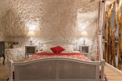 Tenté par une nuit dans un troglo, au beau milieu d’anciennes caves taillées dans la pierre ? C’est au cœur du Val de Loire que les Gîtes Troglodytes de la Rochère vous proposent cette expérience unique ! Pour cette retraite sous terre et tout confort, direction Noizay, charmante commune d’Indre-et-Loire située entre Tours et Amboise. Là, dans un coteau de tuffeau, la pierre locale incontournable, quatre gîtes vous attendent pour un séjour à deux ou en famille. Ces habitations insolites sont typiques de la région : l’extraction du tuffeau pour construire monuments et maisons a laissé place à de nombreuses cavités sous terre ou le long de coteaux. Les lieux sont chargés d’Histoire. Il faut imaginer qu’à la place de votre lit, c’était des tonneaux de Vouvray qui étaient stockés ici-même ! Depuis, Jérôme et Marie-Aymée ont aménagé l’endroit avec goût avec de belles pièces chinées. Les quatre gîtes troglodytiques conçus pour recevoir 2 à 4 personnes se partagent un bout du coteau calcaire qui domine le village. Ils possèdent chacun une terrasse avec vue sur la campagne tourangelle.Au milieu des vignes et à deux pas des grands sites historiques de la région, il y a fort à parier que vous allez tomber amoureux de la douceur de vie locale et de la quiétude qui règne sur place ! Vos hôtes sauront vous indiquer les bonnes adresses pour profiter des alentours en fonction de vos centres d’intérêt.