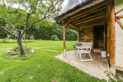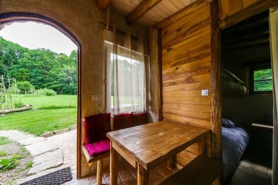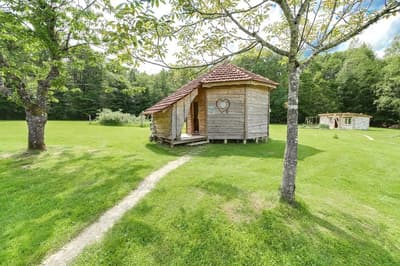 La vallée de l’Ourche vous connaissez ? C’est en plein cœur de la forêt vosgienne, entre Epinal et Vesoul ; là que se trouve la clairière du Verbamont et ce camping écologique. Les trois petits cochons y ont bâti leur cabane et pour le moment, aucun loup n’est venu la souffler. Il faut dire que les propriétaires veillent au grain, sur leur petit cheptel de poules, lapins, canards et brebis. Il faut être vigilant, car même le lynx rôderait dans les parages. Mais n’ayez pas peur, la sorcière du coin vous protègera. Elle a promis de ne jeter un sort qu’aux adultes qui s’approcheraient trop près de la cabane d’Ansel et Gretel. On la repère à ses ornementations en confiserie. Au fait, savez-vous qu’ici les bonbons ont un goût de sapin ? À ce qu’il parait, ils sont excellents pour la gorge. Mais d’autres préfèrent déguster des marshmallows grillés sur le feu de camp. On ne connaît pas les bénéfices sur la santé, mais il y en a évidemment sur le moral. Trêve de sucreries, sinon vous n’arriverez pas à vous endormir. Surtout qu’il est beaucoup plus sain de manger les bons légumes de Cécile et Christophe, issus du potager en permaculture. Ils s’affairent chaque soir à les préparer de la meilleure façon qui soit, pour les servir en table d’hôtes. Juste à côté se trouve l’arboretum de la Hutte, fondé par l’ancien maître des forges en 1874. Les arbres majestueux ont eu le temps de s’épanouir : séquoia géant, hêtre pourpre, tulipier de Virginie … Quelques sculptures dans la roche titillent notre imagination. À juste titre, puisque dans cette contrée les druides se réunissaient. La petite chapelle abandonnée rajoute encore un peu plus au mystère des lieux. Une chose est sûre, quand on quitte cet endroit, on croit davantage aux esprits de la forêt et aux pouvoirs de la nature !