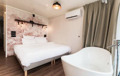Ce cocon d’amour dispose d’un balnéo encastré et profite d’une terrasse lovée au cœur de la Marina de L’Isle Adam dans le Val d’Oise. Idéale pour un week-end insolite ou un séjour romantique en Ile de France, elle comprend une balancelle pour vous prélasser et contempler le coucher du soleil avec votre moitié. Si vous devez travailler, elle comporte également un bureau avec un accès internet.