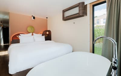 Savez-vous que L'Isle-Adam a été longtemps l'une des destinations favorites des Parisiens souhaitant se mettre au vert ? Il faut avouer que cette ville du Val d'Oise, située sur la rive gauche de l'Oise, à quelque 25 km au nord-ouest de Paris, a bien des arguments pour elle : une ambiance paisible et verdoyante, une plage qui possède toujours ses cabines de bain du XIXe siècle et une notoriété portée par les personnalités (le peintre Fragonard, Balzac...) qui l'ont fréquentée. Rien d'étonnant donc si l'Escale Royale a choisi L’Isle-Adam comme nouvelle adresse pour ses fameuses house boats. Des cabines de bain ?! Pas du tout, des cabanes flottantes aux lignes de vraies maisons, dont on doit l'idée à trois frères, Augustin, Jean-Chrysostome et Jérôme Dumont. Eco-responsables, depuis la « coque » en bois jusqu'à la capsule de café, elles vous offrent par leur situation la possibilité de découvrir le patrimoine naturel et historique de la région. Les trois entrepreneurs les implantent en effet au plus près de la nature, et même carrément au bord de l'eau, sur la rive d'un fleuve ou dans un port de plaisance. L'Isle-Adam correspond aussi au critère de sélection de cette équipe qui souhaite rester proche des grandes métropoles et favoriser la mobilité verte (train, vélo, transport en commun...). Et s'il en existe maintenant plusieurs en France, c'est que les frères Dumont préfèrent développer quelques « hôtels avec une chambre unique » que des hôtels avec plein de chambres. Les house boats de L'Isle-Adam, au design contemporain, sont joliment décorées et particulièrement confortable. Elles feront de jolis nids pour de jeunes couples urbains un peu las de Paris !
