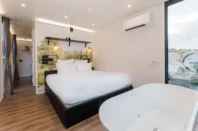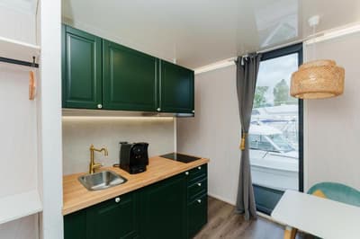 Installée au cœur de la Marina, cette petite chambre flottante est un petit lit douillet. Elle laisse pénétrer la lumière naturelle pour une pièce lumineuse et accueillante. Le mélange de bois, de métal et de verre rend l’ensemble élégant et exotique. Quelques touches de couleurs y ajoutent du peps !