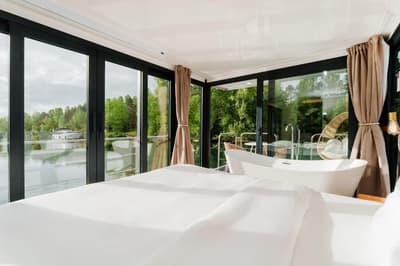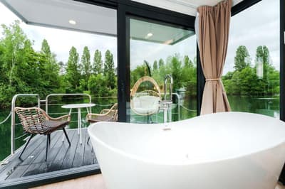 On vous promet un hébergement flottant, des clapotis, et même une île ! L'île en question, c'est l'Ile-de-France, et plus précisément le département de la Seine-et-Marne, à quelques jets de bouée des châteaux de Fontainebleau et de Vaux-le-Vicomte. C'est dire le havre de paix : Paris n'est plus qu'un souvenir, et les cours d'eau font la richesse de ce territoire. Voilà pourquoi on y trouve des House Boat, des bateaux-maisons d'un style très particulier, estampillés Escale Royale. Ces House Boat font partie d'un projet ambitieux de tourisme durable, développé par trois frères, Augustin, Jean-Chrysostome et Jérôme Dumont. Pour ce trio d'entrepreneurs, faire du tourisme, c'est aussi découvrir les paysages et le patrimoine naturel et historique. Voilà pourquoi leurs hébergements sont toujours proches de la nature, et, mieux encore, situés au bord de l'eau, qu'il s'agisse d'un fleuve ou d'un port de plaisance. Ils en ont implanté en Ile-de-France, mais aussi sur la Côte d'Azur : pour eux, pas question d'offrir un hôtel avec plein de chambres, mais plutôt « plein d'hôtels avec une seule chambre ». Leurs House Boat, et notamment les deux qui se situent dans la marina de Saint-Fargeau-Ponthierry sur la Seine, sont aménagées et décorées comme de luxueuses suites hôtelières. Et confortables, qui plus est. De quoi convenir parfaitement à de jeunes couples prêts à s'échapper de Paris pour deux jours !