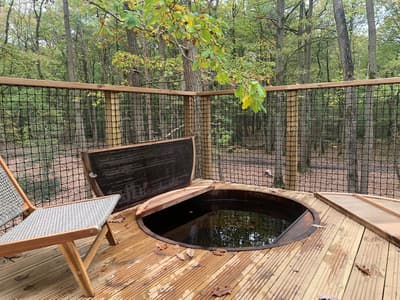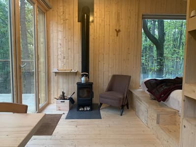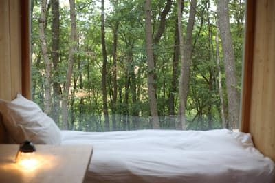 Cette douce lumière qui balaie la campagne, ces touches de couleurs qui font vibrer le paysage, ça ne vous rappelle rien ? Mais oui, on dirait du Monet, du Claude Monet ! Rien de plus normal, nous sommes dans le département de l'Eure, en Normandie. Et Giverny, où Monet sortait chaque jour sa palette, n'est qu'à quelques kilomètres. C'est dans cette région, entre Dreux et Evreux, qu'Augustin et Mathieu, amis de longue date, ont créé « Youza ». Le nom un peu mystérieux est fort en symboles. Il signifie « bonheur », mais il est aussi lié à la notion de nature. Et il va comme un gant au projet durable et écolo que les propriétaires ont élaboré en 2019 : des écolodges abrités par la forêt de La Couture Boussey, qui pour être isolés, déconnectés, soumis aux seuls bruits de la nature, n'en sont pas moins ultra-confortables (électricité, chauffage et eau courante !). Toutes les cabanes sont construites dans le respect de l'environnement. Avec leurs grandes baies vitrées, parfois haussées sur pilotis, elles vous donnent l'impression de vivre dedans-dehors. Pas de wifi, mais des spas (dans certains logis) pour buller en toute quiétude. Pas de restau, mais des paniers-repas qui se posent comme par magie sur la terrasse. Pas de voisins, que du « youza » en couple ou en famille.