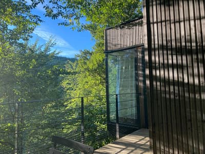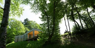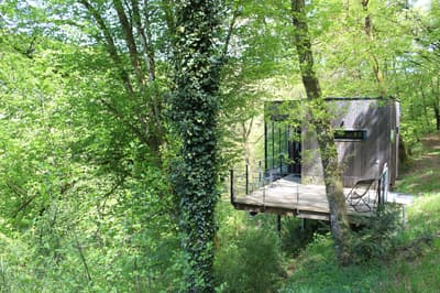 Dans ce département, la forêt domine le paysage. C’est la Corrèze. Il y a bien quelques villages en pierre, entourés par des champs et des pâturages à l’herbe grasse. Mais c’est bien la nature qui gouverne. La moindre parcelle de prairie abandonnée devient une forêt luxuriante. Elle a entièrement repris ses droits au Domaine de Salagnac, qui était autrefois une grande propriété agricole. On s’en rend bien compte en voyant les vestiges du moulin, des étables et des granges, qui faisaient vivre plusieurs familles. Il reste le manoir et ses beaux arbres centenaires. C’est au bord d’un petit chemin forestier à flanc de coteau, que les propriétaires ont eu l’idée de construire des cabanes à l’architecture contemporaine. On dirait des tours de gué qui dominent ce petit vallon touffu. Le ruisseau des dagues coule en contre-bas. Les grandes terrasses et leurs immenses baies vitrées permettent de bien se détendre dans chaque cabane, face au paysage. Il y a de quoi faire une grosse cure de bien-être au cœur des bois ! Ça porte même un nom : la sylvothérapie. Et cette parenthèse forestière, vous pouvez choisir de la partager à deux ou en famille, grâce au canapé dépliable et à la cuisine tout équipée. En gros, un bonne adresse pour un séjour en pleine nature avec full confort, et qui ravira les passionnés de photo ou d’architecture.