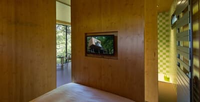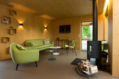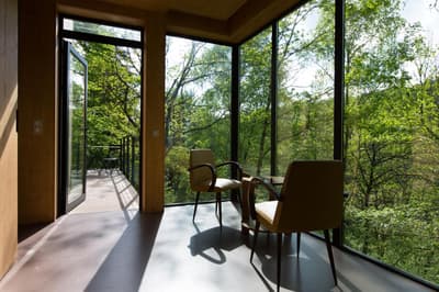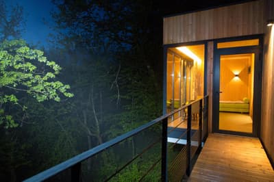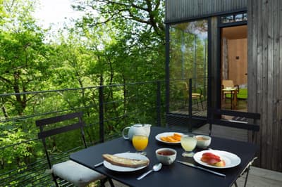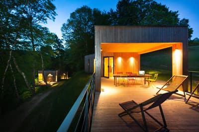 Les Cabanes du Domaine de Salagnac parraissent suspendues au-dessus du vide. On y accède pourtant de plain-pied. Six structures contemporaines au design épuré, qui laisse pleinement entrer la lumière et la forêt, comme un grand écran sur la nature.