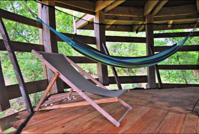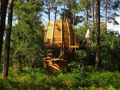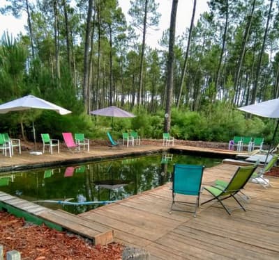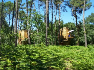 Rien de tel pour vivre au rythme de la nature, que d’être réveillé par les premiers rayons du soleil, traversant la cime des arbres. À tout moment, vous apercevrez un écureuil sauter d’une branche à l’une autre, pour atteindre une pigne de pin. Vous n’entendrez que le doux chant des oiseaux, auxquels vous tenter de ressembler. Ils n’ont d’ailleurs pas l’air surpris de voir quelques humains adopter leur style de vie. Votre nid est toutefois bien plus grand que le leur et ne tient pas sur un arbre. Il est construit à même le sol sur trois niveaux et monte jusqu’à 8 mètres de hauteur, pour tutoyer la canopée. Besoin de prendre l’air ? Envie de vous fondre dans une belle forêt du sud-ouest ? Chez Cap'Cabane vous êtes sur la commune de Captieux, entre la Gironde et les Landes, à 1h de Bordeaux et 45 min de Mont-de-Marsan. Le site vous permet pas mal de découvertes. En une journée vous pourrez aller de l’Océan Atlantique aux vignobles classés du bordelais. Sans compter que le domaine se situe à l’orée du Parc Naturel Régional des Landes de Gascogne. Les cabanes montent à 8 mètres de hauteur et s’ouvrent littéralement sur la nature, avec un toit transparent et une jolie terrasse. Il ne tient qu’à vous d’être suffisamment attentifs pour voir une mésange s’envoler, un écureuil sauter d’un arbre ou un petit groupe de chevreuils, vous saluer au réveil. Vous serez donc réveillés par la lumière du jour et vivrez complètement au rythme du soleil, en immersion avec la nature.En période de vacances, le site devient un vrai petit village avec sa place centrale. On y retrouve un restaurant, une cuisine commune toute équipée, un espace de jeu, des sanitaires et la fameuse piscine naturelle. Les rencontres se font donc facilement à cet endroit. Mais l’on peut tout aussi bien rester à cocooner seul dans sa cabane, faire la sieste dans son hamac, un peu de yoga sur sa terrasse ou lire un livre tout en haut perché.