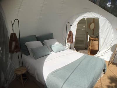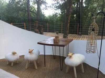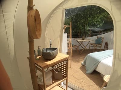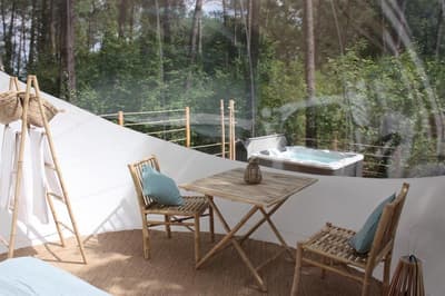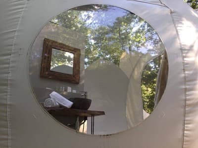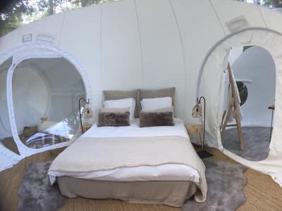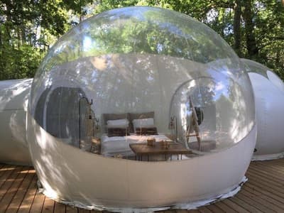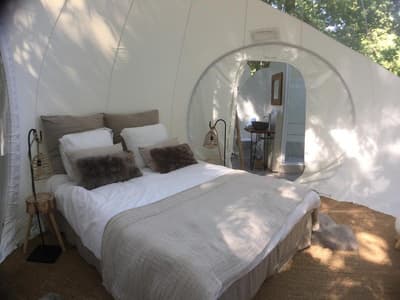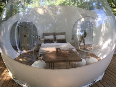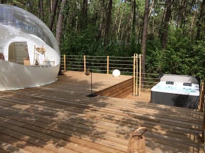 Buller au cœur des vignobles bordelais, ça vous tente ? Installée sur une ancienne propriété viticole de Sallebœuf, à 30 min de Bordeaux, la magnifique adresse de Sophie Krudup a de quoi séduire pas mal de couples ! À la campagne, au milieu des pins et des chênes, les Bulles de Bordeaux vous attendent pour un moment cocooning à deux, loin des sollicitations quotidiennes. Ces bulles entièrement transparentes ou semi-opaques sont posées sur de spacieuses terrasses en bois au milieu de la végétation locale. Le temps d’une nuit ou plus, vous aurez tout le loisir de contempler la nature environnante depuis votre... bulle, terrasse ou jacuzzi ! Car oui, comble du bonheur, chaque bulle est associée à un bain à remous privatif qu’il est possible d’utiliser comme bon vous semble ! On vous recommande la session sous les étoiles, c’est royal ! Dans les bulles, on retrouve une décoration personnalisée avec un petit espace vie, un lit confortable et une salle de bain privative. Massages, petites attentions romantiques et repas savoureux peuvent être réservés pour marquer le coup et passer un moment d’exception. Le respect de l’environnement compte également beaucoup pour Sophie Krudup. L’implantation des bulles, le choix des produits de beauté mis à disposition, le recyclage : rien n’est laissé au hasard.