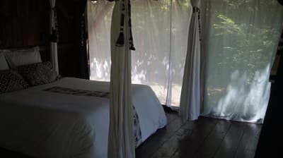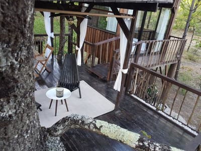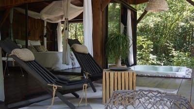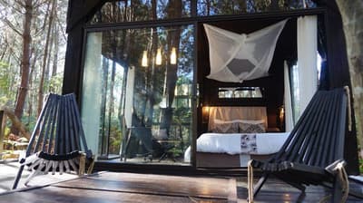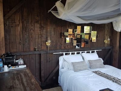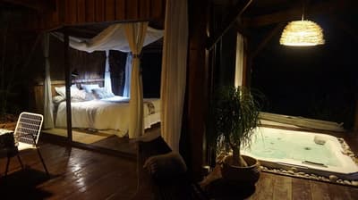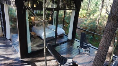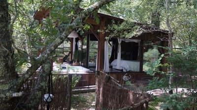 Au cœur des Landes de Gascogne se cachent trois cabanes, dont les murs ont tout simplement été remplacés par des baies vitrées. Faire tomber les cloisons sans renier au confort, c’est le concept des Landines. Bien installé dans votre lit à baldaquin, vous écouterez le chant des oiseaux et pourrez respirer la bonne odeur des pins maritimes. Les moustiquaires permettent d’ouvrir les fenêtres sans crainte, à toute heure du jour et de la nuit, pour ne rien manquer de ce tableau sauvage. On apprécie d’autant plus la fraicheur du sous-bois pendant les chaudes nuits d’été ! Pour se détendre, deux chambres sont équipées d’un jacuzzi et d’une salle de bain extérieure. L’une des cabanes est perchée sur pilotis, et les deux autres ont les pieds sur terre. Le spectacle n’est pas tout à faire le même qu’on soit au ras des fougères ou au milieu du feuillage. Un petit lac permet de se détendre et de méditer. Il a aussi beaucoup à faire dans la région : des châteaux historiques et viticoles à visiter, des lacs et des plages pour se baigner, sans oublier un immense parc naturel où se promener. De quoi se ressourcer en pleine nature sans aucune limite.