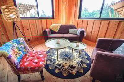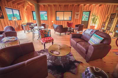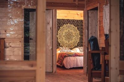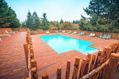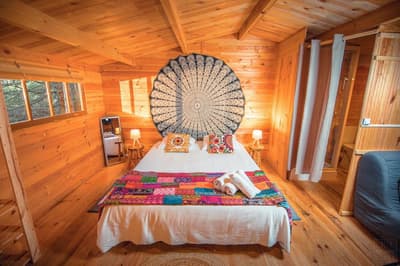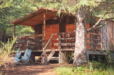Nous sommes dans l’Aude. Ce domaine se trouve à 20 minutes au-dessus de Carcassonne, dans une région qui prend parfois des allures de Far West. Une ancienne ville minière, une montagne mystérieuse et une forêt de grands conifères d’où surgit... un campement ! Il aurait pu être construit par des colons ou des chercheurs d’or. Il y en avait encore jusqu’à très récemment dans le secteur. Heureusement qu’il y a les cigales, les oliviers et les vignes, pour nous rappeler que nous sommes en Occitanie. La nouvelle centrale photovoltaïque du village finit de nous ramener à l’époque contemporaine. Les cabanes et les lodges du Domaine de la Vitarelle sont en fait très récents. D’ailleurs, on est bien content de trouver une piscine, un sauna, un jacuzzi et une salle de bain, tout ce qu’il y a de plus moderne dans sa chambre. Tout est construit en bois, dans un esprit à la fois chic et bohème. Il y a même un petit restaurant sur place, qui sert des planches de tapas et des vins locaux. Depuis Villanière, on part se balader dans des vallées sauvages, au bord des lacs et de rivières qui alimentent le fameux Canal du Midi.