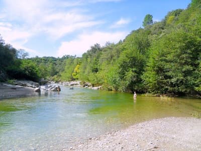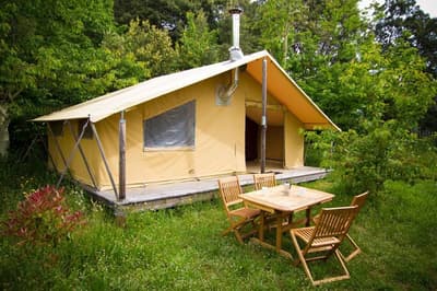 Au Bivouac Nature, on goûte à la magie des Cévennes, à l'ombre des châtaigniers, à la paix des vallats qui découpent leurs contours bleutés jusqu'à l'horizon. Les eaux fraîches du gardon de st Jean, parfaites pour la baignade, coulent en contrebas. L'occasion de 20 minutes de marche à l'ombre. Les 22 tentes Lodges, bien équipées, sont éparpillées dans une ancienne châtaigneraie, partie d'un site Natura 2000, à 250 mètres d'altitude. Elles se répartissent en deux zones : un village où chaque tente possède sa propre salle d'eau, et une zone baroudeur où il n’y a pas d'électricité. On s'y déplace la nuit avec une lampe-tempête pour ne pas concurrencer les milliers d'étoiles qui luisent là-haut: on est sous une réserve internationale de ciel étoilé. En plus du confort des tentes posées sur un plancher de bois, avec de vrais lits, un coin cuisine, et parfois un poêle à bois, le Bivouac Nature est formidable pour ses animations qui mettent l'environnement au coeur du projet et impliquent les enfants. L'été, on réalise des herbiers, on repère les traces de la faune sauvage, on part en randonnées accompagnées. Et on peut même se balader sur les 30 hectares du domaine dont le campement occupe une petite partie, soit 3 hectares. Les plus curieux visiteront St Jean du Gard, à trois kilomètres au sud, ou la Bambouseraie d'Anduze à 13 kilomètres.