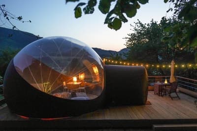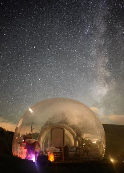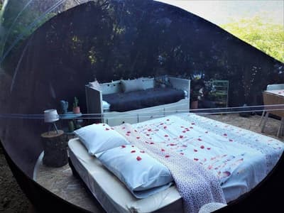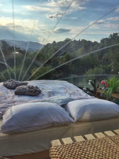 Aux confins de la France, là où nos Pyrénées flirtent avec celles des voisins ibères, se situe la vallée de Campan. À l’aval de cette vallée, le petit village de Gerde sommeille à l’abris des regards. Un air de bout du monde – le village, encaissé, est ceint de collines. Montons-en une ensemble, au hasard. Paf, au détour d’un sentier, le Perchoir des Pyrénées, avec vue sur les montagnes, les françaises et les espagnoles réunies. C’est la famille Waegebaert qui vous accueille. La fille, ses parents, son amoureux, leurs sourires. Loin du bruit du monde, ils ont ensemble créé un havre de paix, un refuge pour doux rêveurs et délicates romantiques à la recherche d’hébergements insolites au coeur d’une nature dense, riche et paisible. Leur domaine est composé de 16 hectares de forêt et de champs doucement inclinés. Les animaux de la ferme laissent place, la nuit tombée, aux animaux sauvages qui sortent des bois – mais qui ne mangent pas d’humain. Bref, il souffle sur le Perchoir une brise d’utopie, hors du temps, loin des tracas, proche des étoiles : pour s’en assurer, il n’y a qu’à s’allonger, bien à l’abris d’une bulle transparente, ou se laisser glisser dans les eaux chaudes d’un bain norvégien en se disant que la vie, au Perchoir, c’est quand même trop bien.