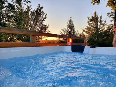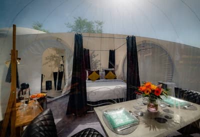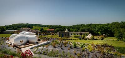 Vous le sentez ce petit air chaud du Sud-Ouest ? À mi-chemin entre Bordeaux et Toulouse, le Domaine Roccas est à Port-Sainte-Marie, dans le Lot-et-Garonne. C’est une cité au bord de... la Garonne donc, où tous les navigateurs marchands faisaient autrefois escale. On dit aussi que Catherine de Médicis y aurait séjourné quelques semaines ! Mais c’est surtout un recoin de campagne extraordinaire. Vous le constaterez au domaine qui est avant tout une ferme où on élève des chèvres et des alpagas pour leur précieuse laine. Le verger bio produit aussi du raisin de table, des kakis et de délicieuses grenades. En parallèle, les propriétaires ont implanté quelques hébergements insolites sur le domaine familial. Seulement six, pour conserver la tranquillité des lieux. Il y a d’abord deux bulles transparentes sur un petit coteau pour contempler pépère le coucher du soleil et la voie lactée. À côté d’elles, deux tentes amérindiennes, un luxueux tipi et une seconde inspirée des habitats inuits, toutes deux équipées d’un poêle à bois. Enfin, deux magnifiques cabanes en bois dans un bout de forêt sauvegardé, au bord des cultures. C’est là qu’on peut observer le plus d’animaux sauvages, depuis la superbe baignoire entourée de fenêtres, ou alors derrière une vitre teintée pour rester discret. Difficile de faire plus confortable, piscine et spa vous attendent pour agrémenter votre séjour. Et puis on ne vous parle même pas du petit-dèj qui est à tomber par terre.